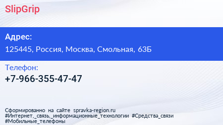 SlipGrip по адресу 125445, Россия, Москва, Смольная, 63Б в дальнейшем Организация, размещена в следующих категориях: