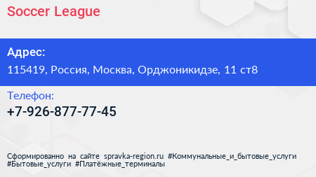 Soccer League по адресу 115419, Россия, Москва, Орджоникидзе, 11 ст8 в дальнейшем Организация, размещена в следующих категориях: