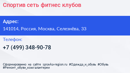 Спортив, сеть фитнес-клубов по адресу 141014, Россия, Москва, Селезнёва, 33 в дальнейшем Организация, размещена в следующих категориях: