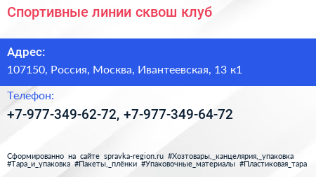 Спортивные линии, сквош-клуб по адресу 107150, Россия, Москва, Ивантеевская, 13 к1 в дальнейшем Организация, размещена в следующих категориях: