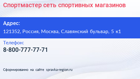 Спортмастер, сеть спортивных магазинов по адресу 121352, Россия, Москва, Славянский бульвар, 5 к1 в дальнейшем Организация, размещена в следующих категориях: