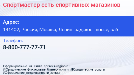 Спортмастер, сеть спортивных магазинов по адресу 141402, Россия, Москва, Ленинградское шоссе, вл5 в дальнейшем Организация, размещена в следующих категориях: