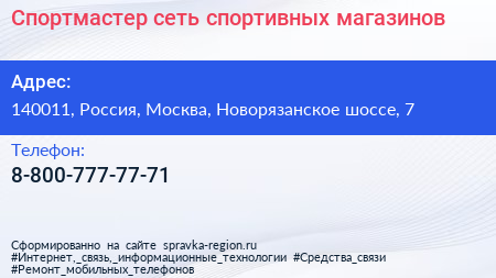 Спортмастер, сеть спортивных магазинов по адресу 140011, Россия, Москва, Новорязанское шоссе, 7 в дальнейшем Организация, размещена в следующих категориях: