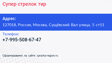 Супер-стрелок, тир по адресу 127018, Россия, Москва, Сущёвский Вал улица, 5 ст11 в дальнейшем Организация, размещена в следующих категориях: