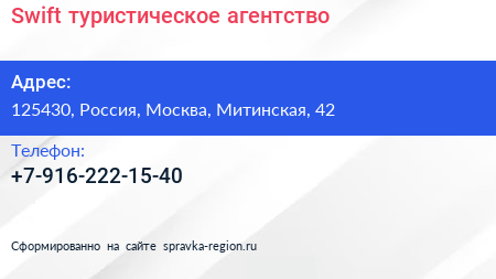 Swift, туристическое агентство по адресу 125430, Россия, Москва, Митинская, 42 в дальнейшем Организация, размещена в следующих категориях: