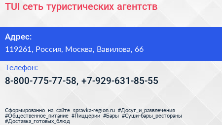 TUI, сеть туристических агентств по адресу 119261, Россия, Москва, Вавилова, 66 в дальнейшем Организация, размещена в следующих категориях: