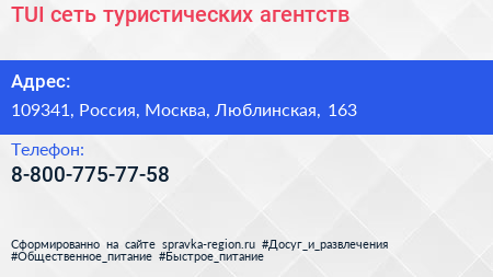 TUI, сеть туристических агентств по адресу 109341, Россия, Москва, Люблинская, 163 в дальнейшем Организация, размещена в следующих категориях: