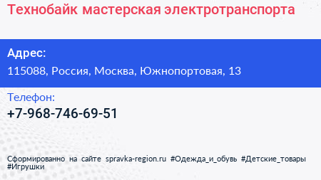 Технобайк, мастерская электротранспорта по адресу 115088, Россия, Москва, Южнопортовая, 13 в дальнейшем Организация, размещена в следующих категориях: