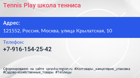 Tennis-Play, школа тенниса по адресу 121552, Россия, Москва, улица Крылатская, 10 в дальнейшем Организация, размещена в следующих категориях:
