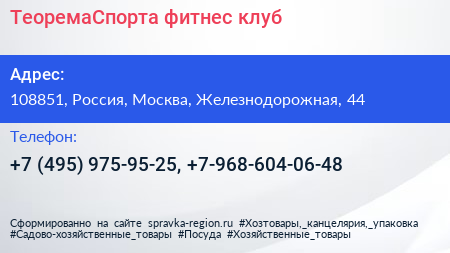 ТеоремаСпорта, фитнес-клуб по адресу 108851, Россия, Москва, Железнодорожная, 44 в дальнейшем Организация, размещена в следующих категориях: