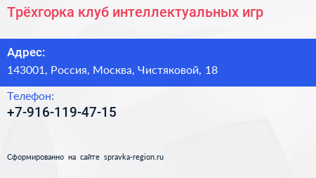 Трёхгорка, клуб интеллектуальных игр по адресу 143001, Россия, Москва, Чистяковой, 18 в дальнейшем Организация, размещена в следующих категориях: