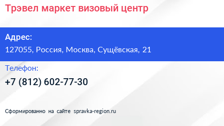 Трэвел маркет, визовый центр по адресу 127055, Россия, Москва, Сущёвская, 21 в дальнейшем Организация, размещена в следующих категориях: