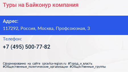 Туры на Байконур, компания по адресу 117292, Россия, Москва, Профсоюзная, 3 в дальнейшем Организация, размещена в следующих категориях: