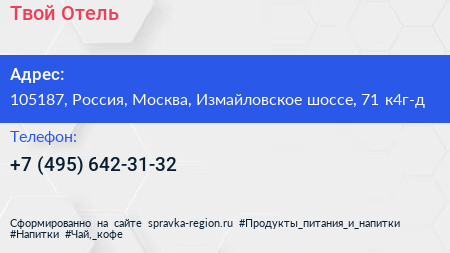 Твой Отель по адресу 105187, Россия, Москва, Измайловское шоссе, 71 к4г-д в дальнейшем Организация, размещена в следующих категориях: