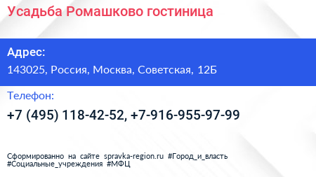 Усадьба Ромашково, гостиница по адресу 143025, Россия, Москва, Советская, 12Б в дальнейшем Организация, размещена в следующих категориях: