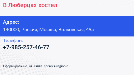 В Люберцах, хостел по адресу 140000, Россия, Москва, Волковская, 49а в дальнейшем Организация, размещена в следующих категориях: