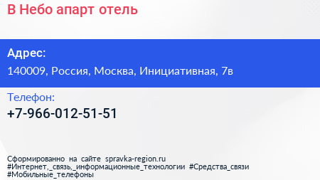 В Небо, апарт-отель по адресу 140009, Россия, Москва, Инициативная, 7в в дальнейшем Организация, размещена в следующих категориях:
