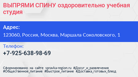 ВЫПРЯМИ СПИНУ, оздоровительно-учебная студия по адресу 123060, Россия, Москва, Маршала Соколовского, 1 в дальнейшем Организация, размещена в следующих категориях: