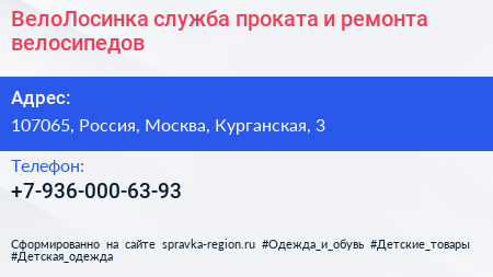 ВелоЛосинка, служба проката и ремонта велосипедов по адресу 107065, Россия, Москва, Курганская, 3 в дальнейшем Организация, размещена в следующих категориях: