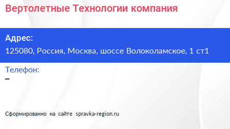 Вертолетные Технологии, компания по адресу 125080, Россия, Москва, шоссе Волоколамское, 1 ст1 в дальнейшем Организация, размещена в следующих категориях: