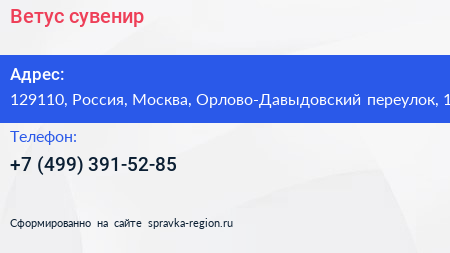 Ветус-сувенир по адресу 129110, Россия, Москва, Орлово-Давыдовский переулок, 1 в дальнейшем Организация, размещена в следующих категориях: