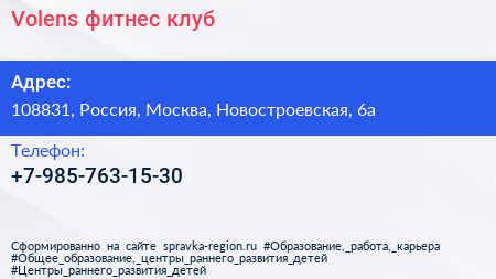 Volens, фитнес-клуб по адресу 108831, Россия, Москва, Новостроевская, 6а в дальнейшем Организация, размещена в следующих категориях: