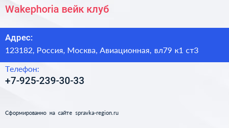 Wakephoria, вейк-клуб по адресу 123182, Россия, Москва, Авиационная, вл79 к1 ст3 в дальнейшем Организация, размещена в следующих категориях: