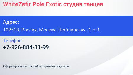 WhiteZefir Pole & Exotic, студия танцев по адресу 109518, Россия, Москва, Люблинская, 1 ст1 в дальнейшем Организация, размещена в следующих категориях: