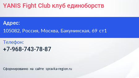 YANIS Fight Club, клуб единоборств по адресу 105082, Россия, Москва, Бакунинская, 69 ст1 в дальнейшем Организация, размещена в следующих категориях: