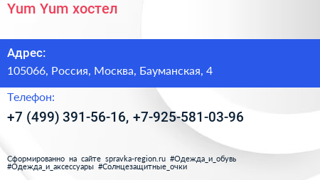Yum Yum, хостел по адресу 105066, Россия, Москва, Бауманская, 4 в дальнейшем Организация, размещена в следующих категориях: