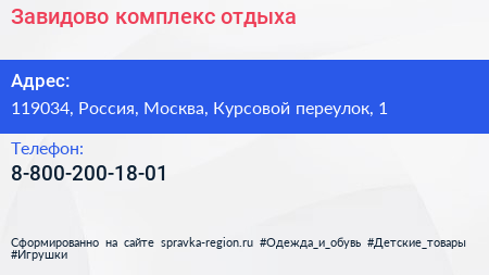 Завидово, комплекс отдыха по адресу 119034, Россия, Москва, Курсовой переулок, 1 в дальнейшем Организация, размещена в следующих категориях:
