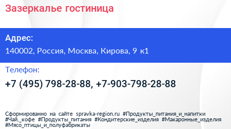 Для связи с организацией воспользуйтесь номером телефона: +7 (495) 798-28-88, +7-903-798-28-88. Ежедневно с 00:00 до 24:00, вы можете обратиться в эту организацию.