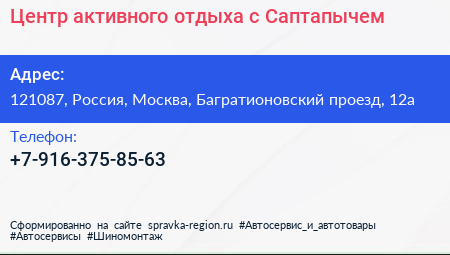 Центр активного отдыха с Саптапычем по адресу 121087, Россия, Москва, Багратионовский проезд, 12а в дальнейшем Организация, размещена в следующих категориях: