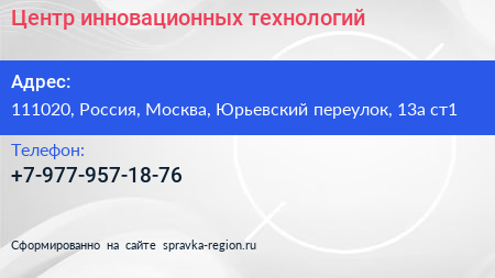 Центр инновационных технологий по адресу 111020, Россия, Москва, Юрьевский переулок, 13а ст1 в дальнейшем Организация, размещена в следующих категориях: