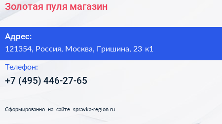 Золотая пуля, магазин по адресу 121354, Россия, Москва, Гришина, 23 к1 в дальнейшем Организация, размещена в следующих категориях:
