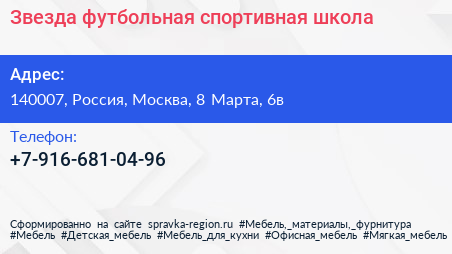 Звезда, футбольная спортивная школа по адресу 140007, Россия, Москва, 8 Марта, 6в в дальнейшем Организация, размещена в следующих категориях: