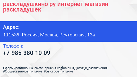раскладушкино.ру, интернет-магазин раскладушек по адресу 111539, Россия, Москва, Реутовская, 13а в дальнейшем Организация, размещена в следующих категориях: