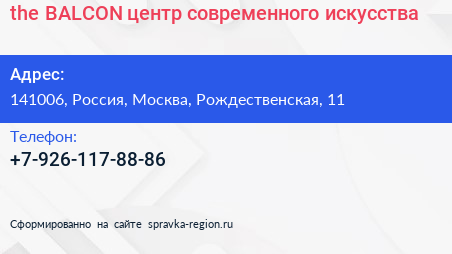 the BALCON, центр современного искусства по адресу 141006, Россия, Москва, Рождественская, 11 в дальнейшем Организация, размещена в следующих категориях: