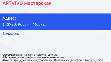 ARTVIVO, мастерская по адресу 143930, Россия, Москва, в дальнейшем Организация, размещена в следующих категориях: