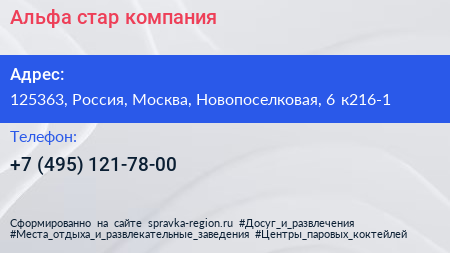 Альфа-стар, компания по адресу 125363, Россия, Москва, Новопоселковая, 6 к216-1 в дальнейшем Организация, размещена в следующих категориях: