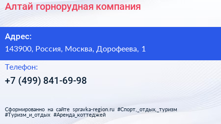 Алтай, горнорудная компания по адресу 143900, Россия, Москва, Дорофеева, 1 в дальнейшем Организация, размещена в следующих категориях: