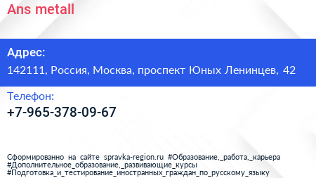 Ans-metall по адресу 142111, Россия, Москва, проспект Юных Ленинцев, 42 в дальнейшем Организация, размещена в следующих категориях: