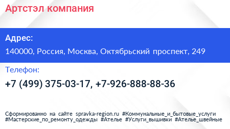 Артстэл, компания по адресу 140000, Россия, Москва, Октябрьский проспект, 249 в дальнейшем Организация, размещена в следующих категориях:
