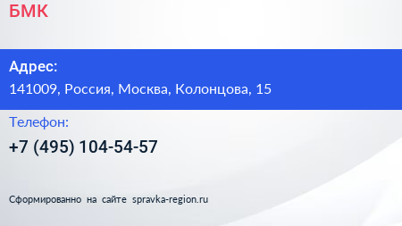БМК по адресу 141009, Россия, Москва, Колонцова, 15 в дальнейшем Организация, размещена в следующих категориях: