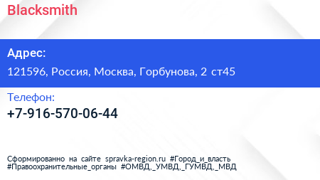 Blacksmith по адресу 121596, Россия, Москва, Горбунова, 2 ст45 в дальнейшем Организация, размещена в следующих категориях: