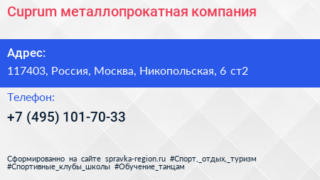 Cuprum, металлопрокатная компания по адресу 117403, Россия, Москва, Никопольская, 6 ст2 в дальнейшем Организация, размещена в следующих категориях: