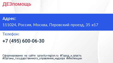 ДЕЗпомощь по адресу 111024, Россия, Москва, Перовский проезд, 35 к17 в дальнейшем Организация, размещена в следующих категориях: