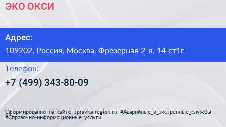 ЭКО ОКСИ по адресу 109202, Россия, Москва, Фрезерная 2-я, 14 ст1г в дальнейшем Организация, размещена в следующих категориях: