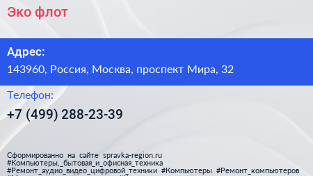 Эко-флот по адресу 143960, Россия, Москва, проспект Мира, 32 в дальнейшем Организация, размещена в следующих категориях: