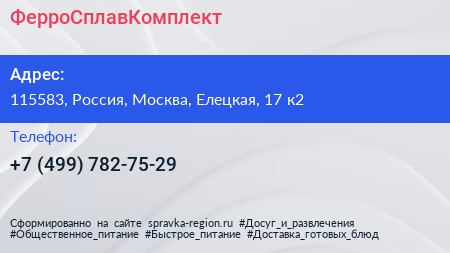 ФерроСплавКомплект по адресу 115583, Россия, Москва, Елецкая, 17 к2 в дальнейшем Организация, размещена в следующих категориях: